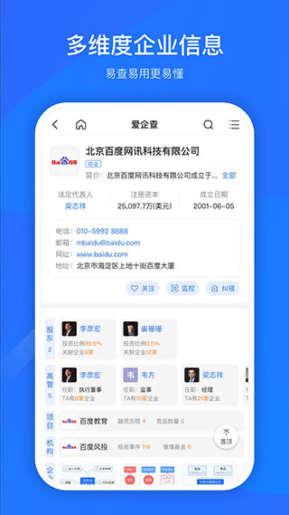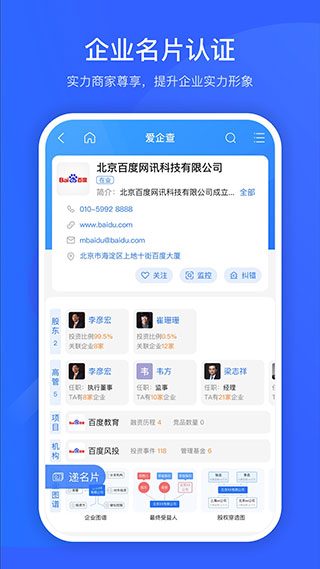 2、企业信息:工商、变更、股权结构、主要人员、分支机构、企业图谱等;
