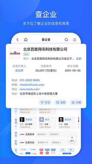 爱企查苹果版是一款功能强大且十分实用的企业信息查询软件,主要是用于帮助那些在网招聘的小伙伴们使用,在这里可以查询到全国各地企业的详细信息,列如该企业的法人、股东、高管、图谱、品牌项目、发源地、创建时间、所属行业、官方网址、目前所在地等各种方面的资讯应有尽有。而且,其中一切信息都是由国家公共信用信息中心倾力提供的,安全有保障,最大程度的避免了用户误入皮包公司,有需要的小伙伴可不要错过了。