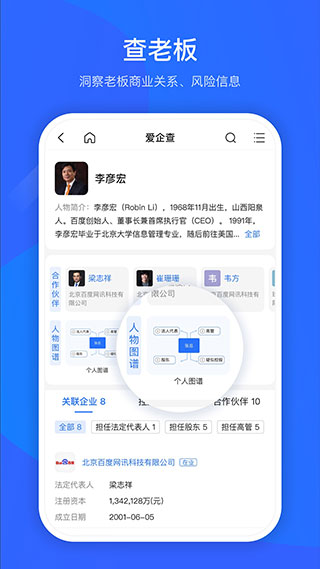1、老板信息:个人图片、商业角色、所有企业、合作伙伴等;