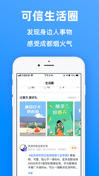 “天府市民云”是一个服务全面的移动互联网平台。它涵盖网上办事、信息沟通、交通出行、医疗服务、便民缴费等服务市民的各方面,可以为市民提供衣食住行、生老病死、安居乐业的全方位服务。